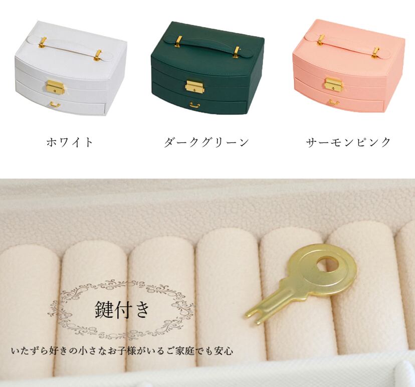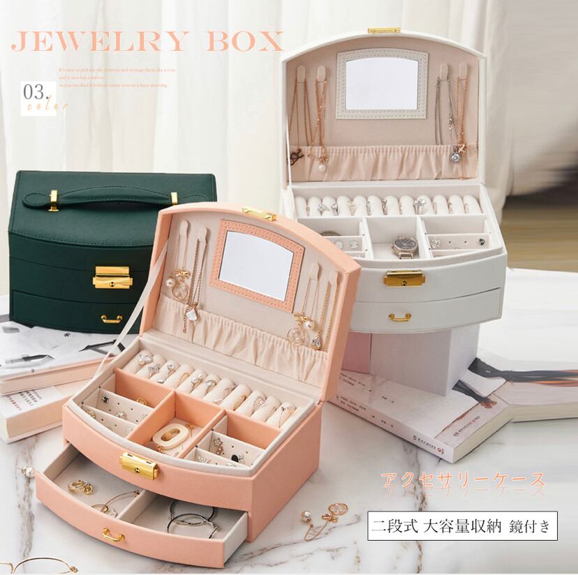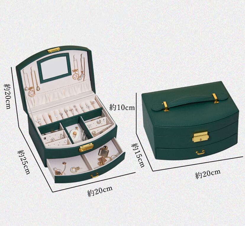 大容量収納の二段式仕様、外側が高級感のあるPUレザー製、内側が柔らかな起毛素材で大切なジュエリーをキズからしっかり守る。